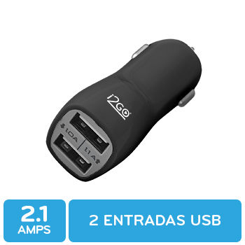 Carga 2 dispositivos USB al mismo tiempo. ● Carga rápida 2.1A | 10 Watts. ● 40% más rápido que un cargador común. ● 3 años garantía de fábrica con i2GO. ● 4 colores para elegir: negro, blaco, azul y rosa. ● Entrada 12-24 v DC/Salida: 5v-2.1 Amps. ● Seguridad energética y cuidado ambiental: certificación RohS, CE y FCC.